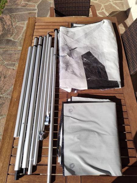 Meine Markise war eine Thule Omnistor 4,50m Länge und 2,75 m Auszug, Montage der Seitenwand ist die linke Seite, Seitenwand und Front sind verbindbar. Seitenwand wird in das Zusatzgestänge mittels Keder eingezogen, Front in die Kederleiste der Markise.