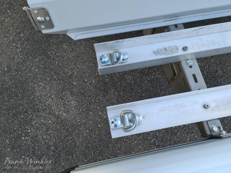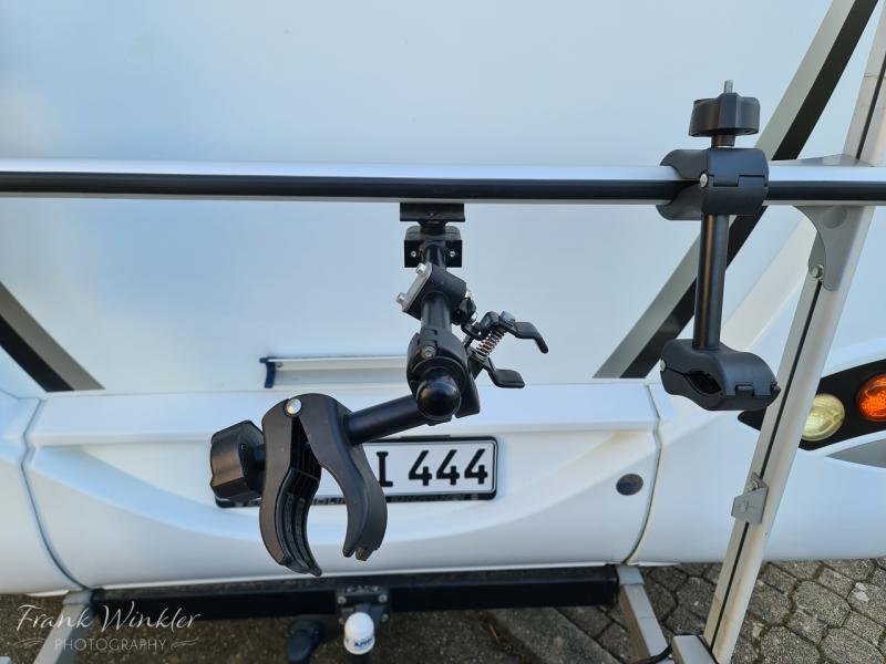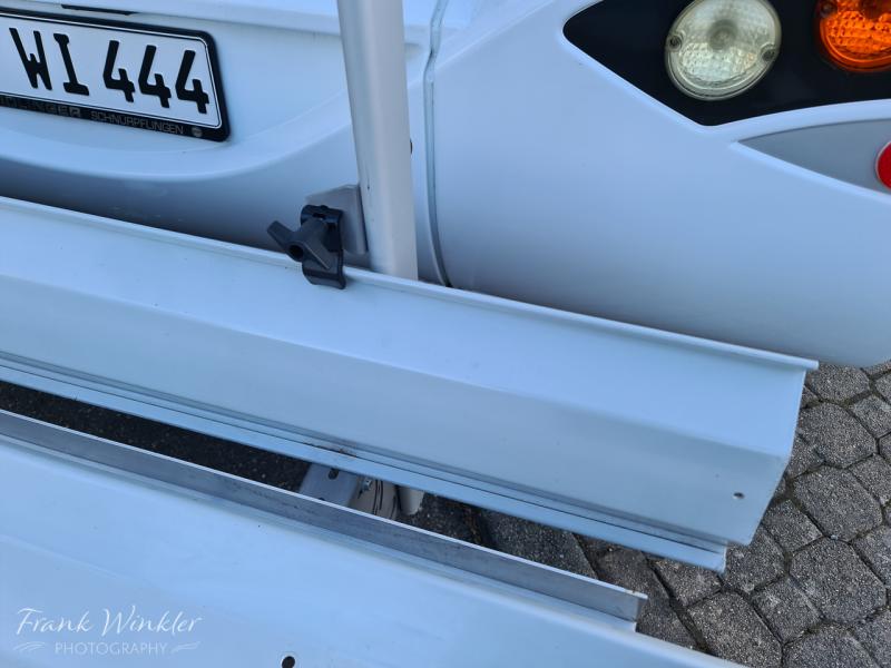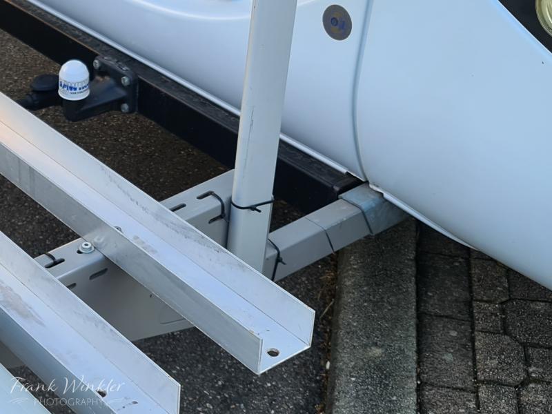 Zubehör wie Zurrlaschen, Haltearme, Ersatz-Abschlusskappen sind ebenfalls dabei. Der Neupreis betrug 1.200 EUR (ohne Fahrradschienen)