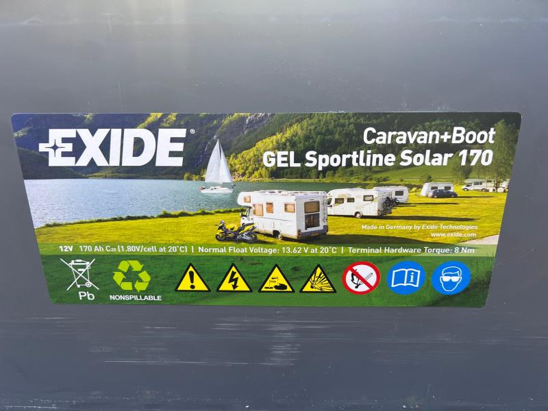 3 Stück EXIDE Caravan Boot GEL Sportline Solar 170 Spannung 12 Volt Kapazität:170 Ah C20 1.80V/ cell at 20 Grad C Normal Float Voltage: 13,62 V at 20 Grad CVerschlossen und wartungsfrei Tiefentladesicher lt. Hersteller Batterietyp: Blei GEL Akku VRLA verschlossen Made in Germany by Exide Technologies
