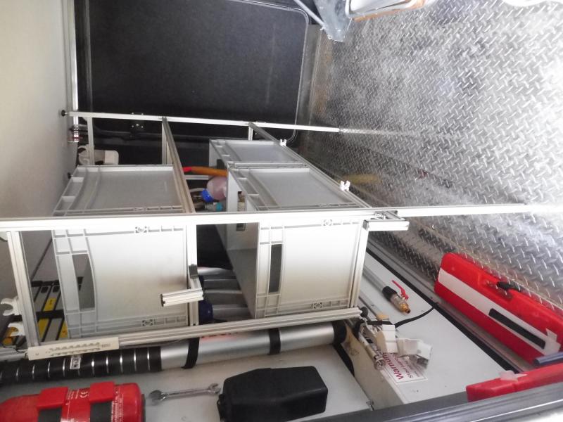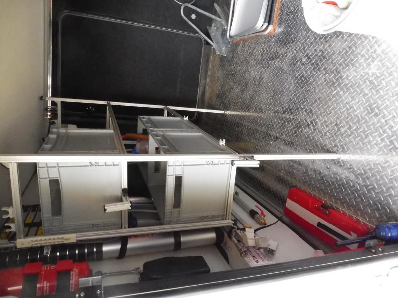 Lagersystem für Wohnmobil mit 5 Euro Boxen 40x30x27 cm. Gesamtlänge125, Höhe 130 cm, Tiefe 30 cm.