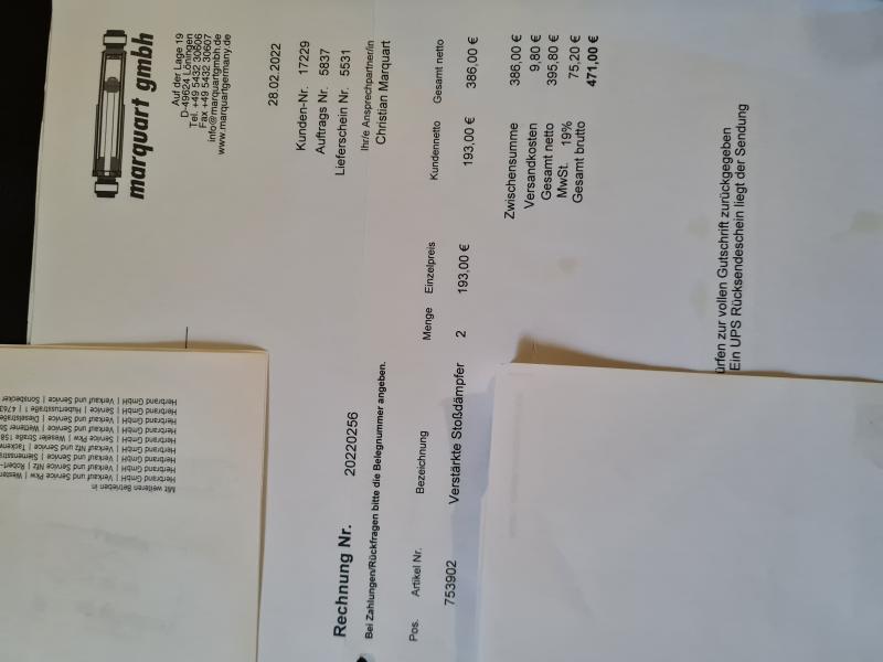 | Beschreibung: | Biete hier verstärkte Stoßdämpfer der Fa. Marquardt zum Kauf an. Da wir unseren Bürstner Lyseo M verkauft haben und wieder die originalen Dämpfer eingebaut haben stehen diese jetzt zum Verkauf Kaufdatum war der 28.2. 2022 und es wurden ca 10000 km damit gefahren, also noch neuwertig. Neupreis lag bei 471€ |