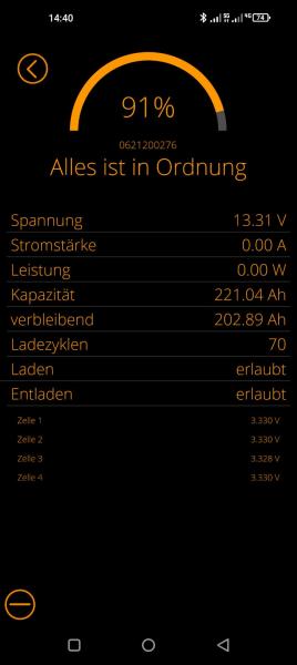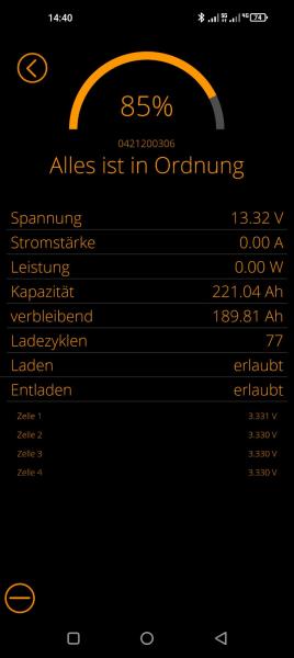 | Beschreibung: | Verkaufe 2 x Liontron 200Ah Lithium Batterien. Insgesamt 400Ah. Einzeln oder im Paket. Beide Akkus Ende 2022 gekauft und wie neu. Nur je 70 und 77 Lade-Zyklen. Originalrechnung und noch restliche Monate der gesetzlichen Gewährleistung vorhanden. Einwandfreier Zustand. Verkauf wegen Umstieg auf 2 x 300AH.