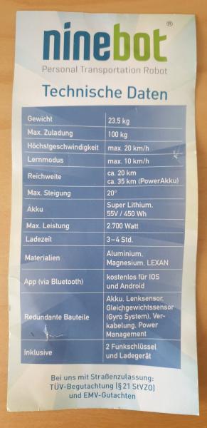 | Beschreibung: | Segway Ninebot Elite + Neuwertig Angeboten wird hier ein guter Segway Ninebot Elite + Das Segway ist 22km/h schnell und hat eine Straßenzulassung das Teil ist in einem Neuwertigem Zustand und hat momentan 587 km gelaufen es hat eine Reichweite von ca.20 km es ist bis März 2024 angemeldet . Der Ideale Camping bekleider ! Das Segway lässt sich sehr gut in der Kofferaum transportieren in dem man die Lenkstange mit einer Schraube entfernt. Das Fahrzeug wird mit einer Seitentasche verkauft es gibt dazu 2 Fernbedienungen die alleine a. 60 € kosten . Papiere ,Bedienungsanleitung und Ladegerät alles dabei . Das Teil wird nicht verschickt ! Standort 67304 Eisenberg in der Pfalz 017388118014 |