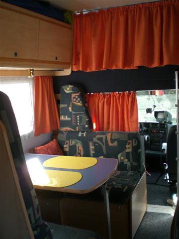 Von den ursprünglich 6 Betten (2x Alkoven, 2 x Sitzgruppe und 2 x Hecksitzgruppe (2 Betten übereinander)) wurde aus dem zum Bett herunterklappbaren Oberschrank die Matratze entfernt (ist jedoch vorrätig) und durch Einbau von 2 Trennwänden (jederzeit leicht durch Entfernen der Halteschrauben rückbaubar) ein Oberschrank mit 3 Staufächern geschaffen. |