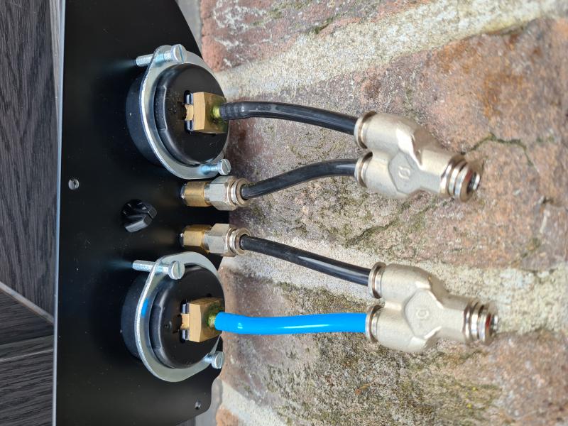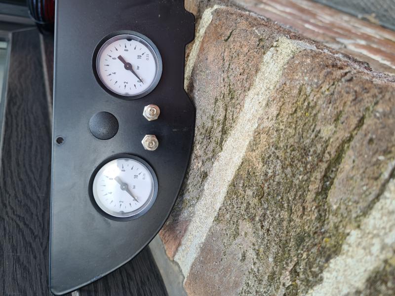 Das Bedienteil verfügt über 2 Manometer, um den Luftdruck beider Bälge zu kontrollieren und über 2 Autoventile - hierüber kann die Luftfedérung aufgepumt werden: