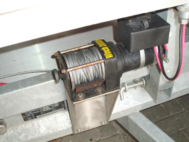 Die Firma Fiedler hat mir eine Kiste mit Halterung aus Alu gebau, in der sich der Akku für die Seilwinde und das Reserverad befindet. Obendrauf Solarzelle zum Laden des Akkus. Seilwinde vorne rechts. Auffahrschienen 3m inter dem Aluboden in Schächten. Die Kiste ist nach vorne verschiebbar, damit man auch größere PKW tranportieren Kann. Ich habe für dden Anhänger komplett mit Anbauten 6200 hingeblättert. |