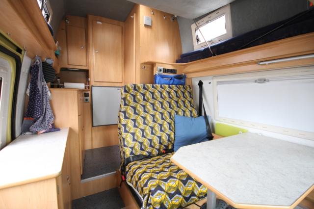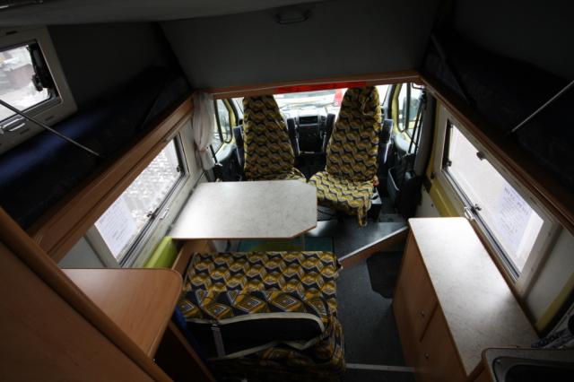 Ausbau: 4 Sitzplätze: 2 Pilotensitze m. Armlehnen, drehbar, 2 auf der Sitz-/Schlafbank; 4 Schlafplätze: 2 im Hochdach / Hubbett mit Froli-Liegesystem, L x B = 210 x 160 cm, 2 durch Umbau der Sitzbank; L x B = 195 x 130 cm