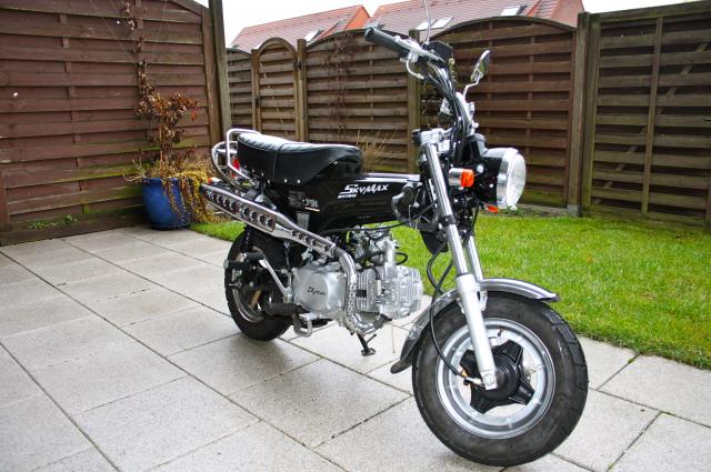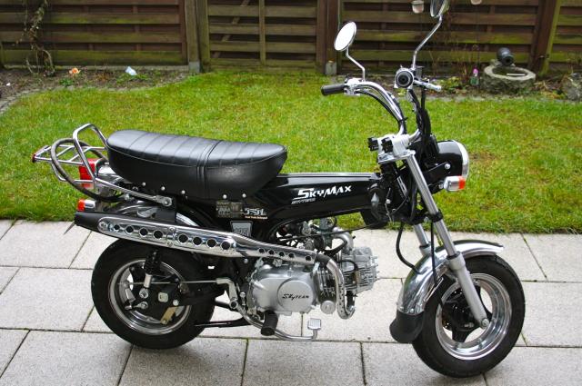 Kräftiger 1-Zylinder 4-Takt Motor, luftgekühlt Hubraum 124 ccm Bohrung, Hub 52,4 x 57mm Kompression 9,0 : 1 Maximale Leistung 5,0KW bei 6500 U/min. Maximales Drehmoment 7,3 Nm bei 5500 U/min. Höchstgeschwindigkeit 89 km/H Vergaser Mikuni 22 83419 Zündung elektronisch, CDI Starter Elektrisch und Kickstarter Getriebe 4-Gang europäische Schaltung Kettenantrieb Tankinhalt 5,5 Liter Motoröl ca. 800ml Fahrwerk Stahlrahmen einrohrig Vordergabel 30mm Durchmesser Vorderbremse hydraulische Scheibenbremse Hinterradbremse Trommelbremse Bereifung vorne/hinten 3.50-10 Leergewicht 74.-kg Höchstgeschwindigkeit über 82 Km/h dadurch sehr günstig in der Versicherung. Ein ideales Reisegefährt für alle Wohnmobil, Wohnwagen Besitzer oder für alle die Spaß haben wollen.
