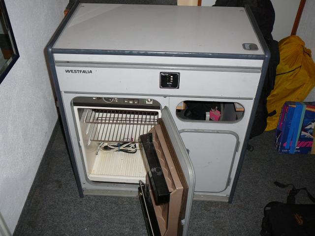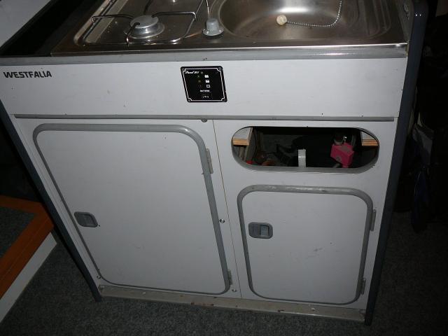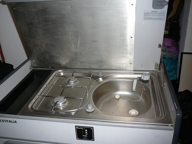 Er besteht aus einer Spüle mit Wasserhahn, ein sehr leistungsfähiger Kühlschrank der auf 220V und 12V oder Gas betrieben werden kann sowie einem 2-flammigem Herd (gas). Eine Schublade ist leider irgendwann mal abhanden gekommen (siehe Bilder). |