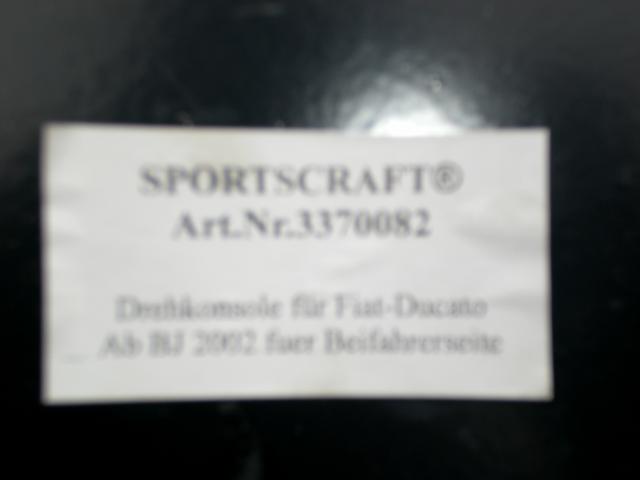 | Beschreibung: | Verkaufe zwei Drehkonsolen für Fiat Ducato ab Bj 2002-2006 von der Firma Sportscraft. Ich habe die Konsole aber auch schon bei einem Ducato vor Bj.2002 gesehen. Die Drehkonsole wird einfach zwischen dem Sitz und der Sitzkonsole geschraubt. Der Lochabstand beträgt längs 32cm und quer 40cm.