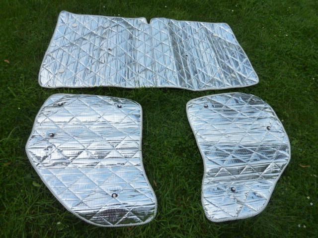Alle 3 Thermomatten für Frontscheibe und Fenster rechts und links sind alubeschichtet und mit Saugnäpfen. Sowohl für Sommer- als auch für Wintercamping wichtig.
