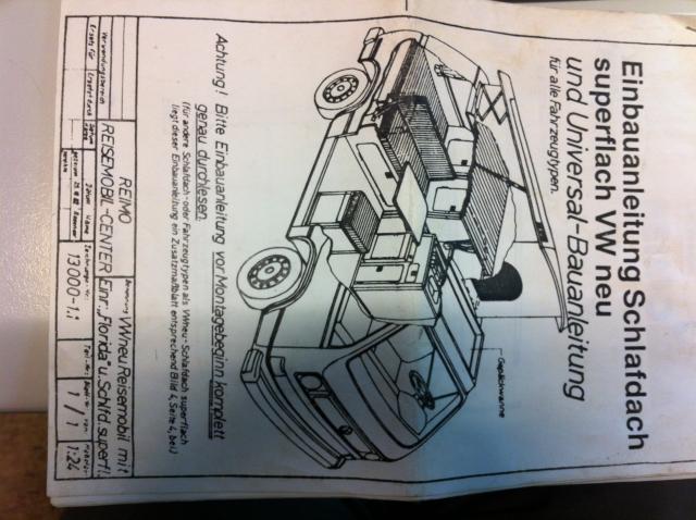| Beschreibung: | Gebrauchtes Schlafdach der Firma Reimo was auf einen Ford Transit BJ. 12/1991 montiert war mit "Einbauanleitung Schlafdach Superflach VW neu und Universial-Bauanleitung für alle Fahrzeugtypen." und bemaßung "Ford Transit 86, kurzer Radst. Dachausschnitt und Schlafdach-aufbau hinten hoch".