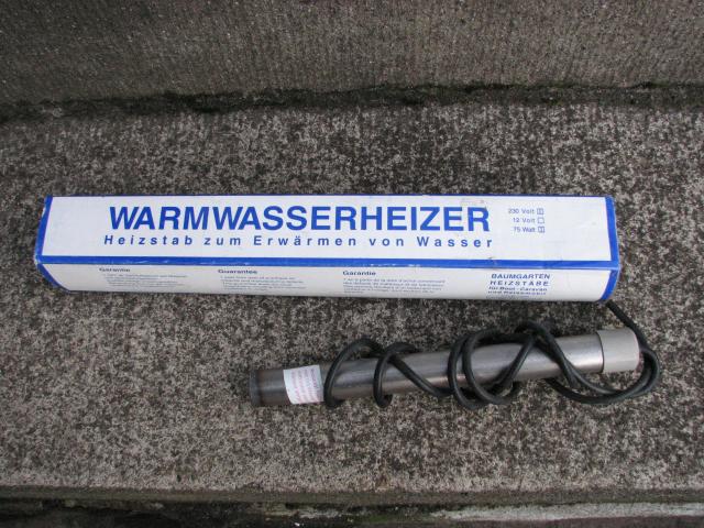 biete hier an : unbenutzter HEIZSTAB , der an 220 V ( Schukostecker ) ca 40 Grad liefert und einfach in einen Wassercontainer gelegt wird . für Warmwasserbereitung zum Duschen / Waschen.