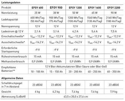 Für den normalen Gebrauch, erst recht in Verbindung mit Solar ist die Leistung des Efoy ausreichend für TV + Radio +++ und Dank seiner leisen Betriebsart auf jeden Stellpl.-Campingplatz einsetzbar.