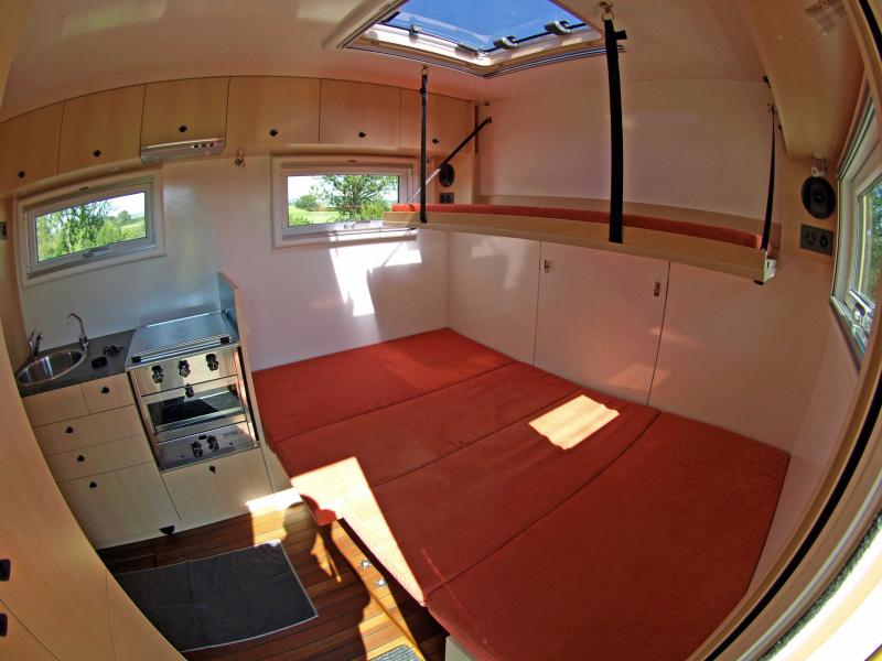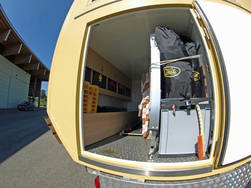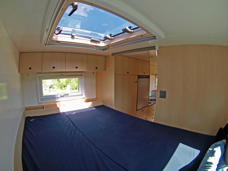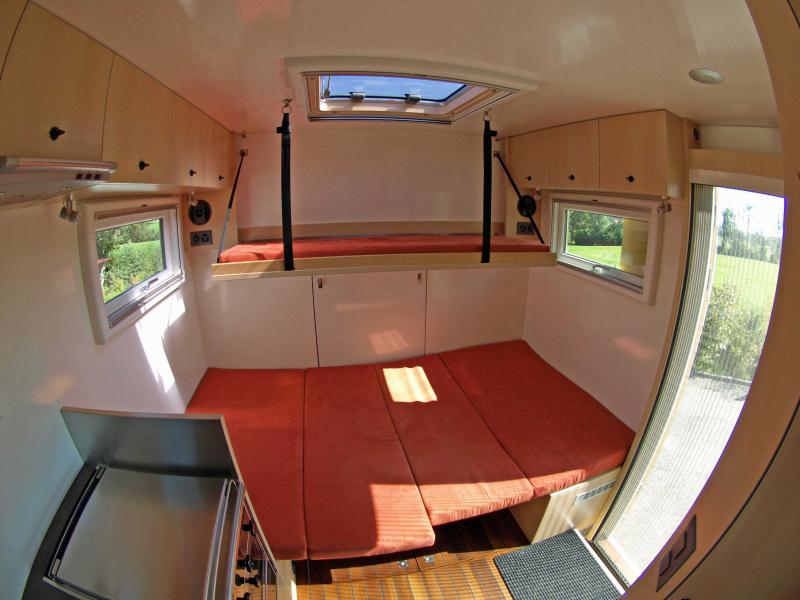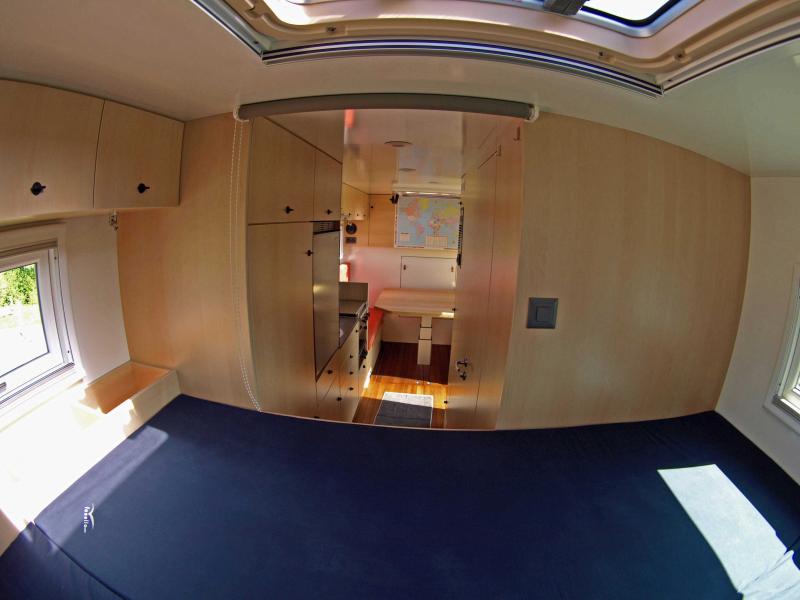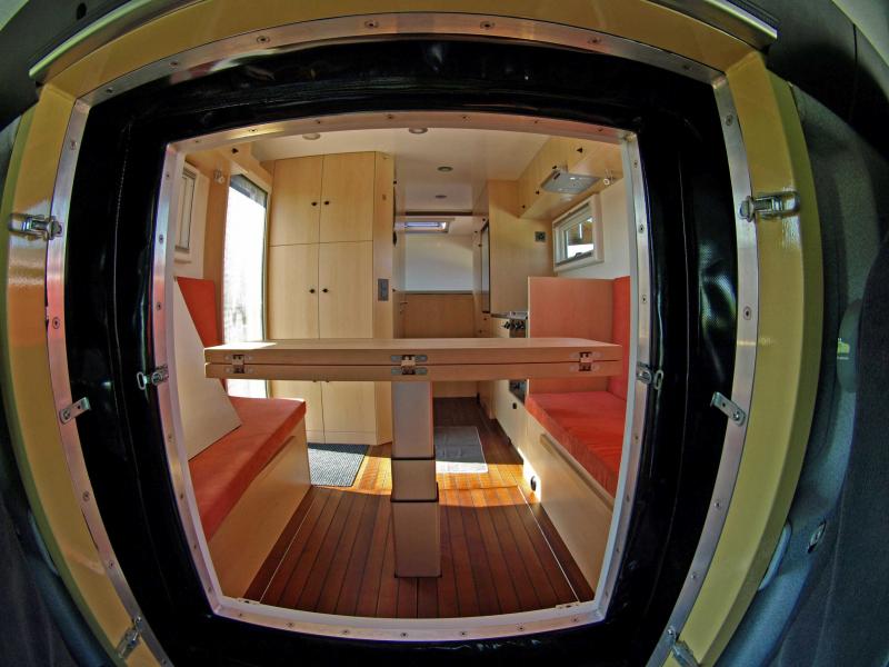 Wohnkabine: Selbsttragende GFK-Kabine in Sandwichplattentechnik mit PU Schaum isoliert. 60mm Wandstärke, 120mm Bodenstärke, gewebeverstärkte Deckschichten 3/2mm Hochwertiger Gelcoat aussen, durchgefärbt in RAL 1002 Grosse, doppeltürige Heck-Garage für multifunktionalen Gebrauch