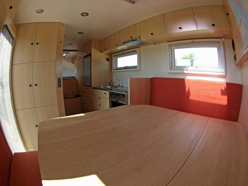 Küche: Handgefertigte Premium-Küche mit Vollauszügen, Schubladen, Oberschränken Dunstabzug mit stufenlosem Gebläse Sonderanfertigung Petrolkocher kombiniert mit Backofen, alles in Edelstahl Arbeitsfläche mit grossem Chromstahl Spülbecken, flächenbündig eingelassen Haushaltarmaturen, Chromstahl, Keramik-Kartusche Kühlschrank Kompressortechnik ca. 160 L mit sep. Tiefkühlfach
