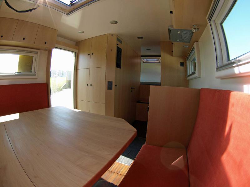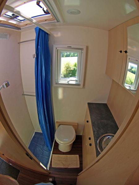 Bad / WC Raum: Grosszügiges Bad/WC mit abgetrennter Dusche Dachfenster in trittfestem Acrylglas und Sekuritglasfenster seitlich Duschwanne in Edelstahl pulverbeschichtet, Duscharmatur mit Gleitstange Einhebelmischer Waschbecken und Dusche mit Keramikkartusche Waschtisch mit ovalem Waschbecken aus Edelstahl Keramische Spültoilette mit Fäkalientank 140L Sitzgruppe / Betten: Grosszügige Sitzgruppe mit Esstisch elektrisch absenkbar Sitzgruppe umbaubar wahlweise in grosses Doppelbett Zusätzliches, klappbares Einzelbett vorne über Durchgang (als 5. Schlafplatz) Grosses Festbett erhöht im Heck, ca. 215 x 160 cm Stoffbezüge und Sitzpolster in Objektstoff Hochwertiges, atmungsaktives Bettsystem