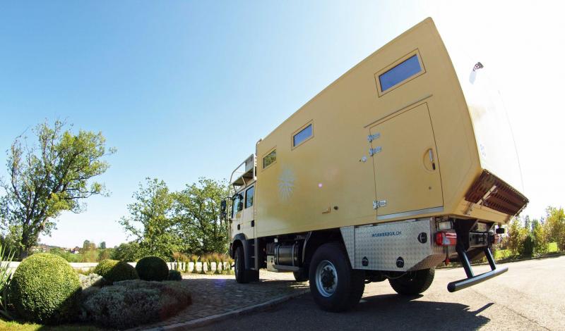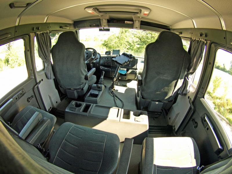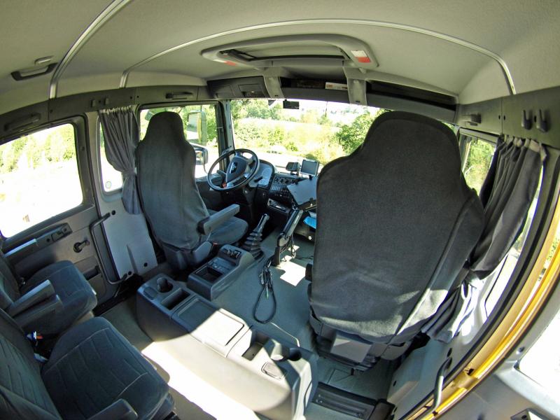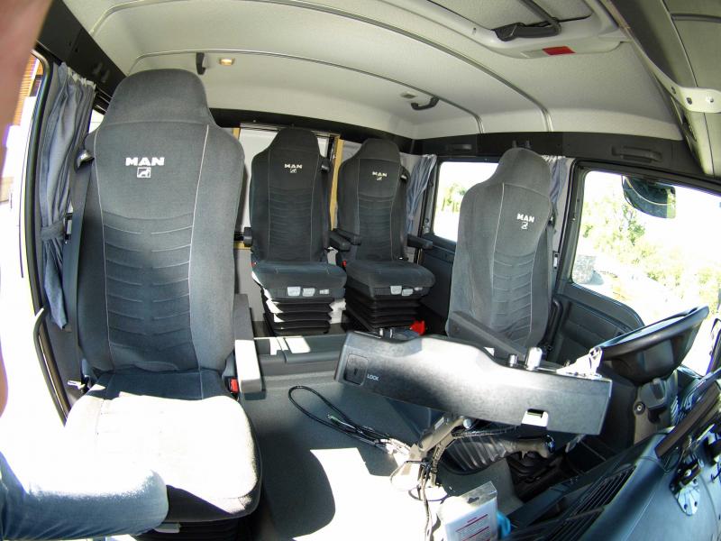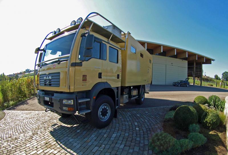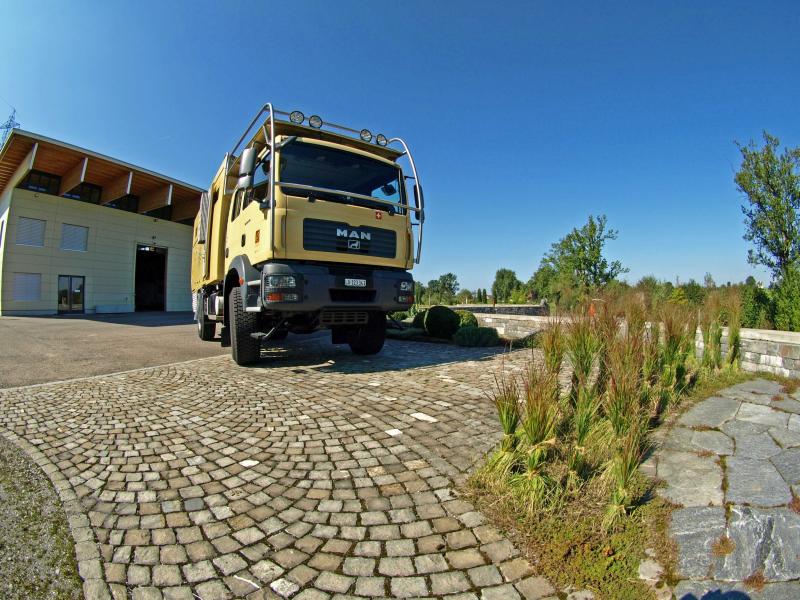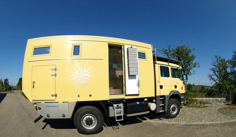 Technische Ausstattung Fahrgestell: verwindungsflexibler Hilfsrahmen zur Aufnahme der Torsionskräfte Fahrgestell und Aufbau Radstand 4500 mm 6 Zylinder Turbodiesel 6871ccm, 280 PS, Euro 4 ohne Ad Blue 9 Gang Getriebe mit elektr. zuschaltbarem Reduktionsgetriebe Räder 11R20 mit Bereifung 395/85 R 20 Michelin XZL Dachgepäckträger und Astabweiser in Edelstahl Reserverad auf Trägersystem über dem Fahrerhaus mit Hebekran Allradantrieb zuschaltbar mit sperrbarem Längsdifferential Vorder- und Hinterachsdifferential sperrbar 100% Kraftstoffvorrat total 600 L Batterien verstärkt 2 x 170 Ah verstärkte Lichtmaschine Drehstrom 28V/3080 W/110A verstärkte Stabilisatoren für Vorder- und Hinterachse Kraftstoff-Zusatzfilter mit Wasserabscheider Heizung für Kraftstoffilter Schutzgitter für Scheinwerfer Unterfahrschutz hinten klappbar für Geländeeinsätze