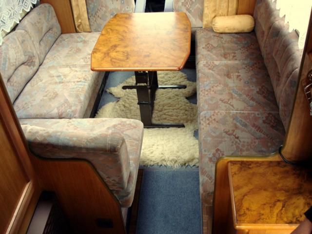 Luftfederung hinten, Fahrertür, Markise inkl. Safariroom (Seitenteile und Vorderwand), Vorzeltteppich, Heckküche, 3 Flammenkocher, Kühlschrank mit großem Gefrierfach, Nasszelle(neues Waschbecken) mit Kassettentoilette, 2 lange Sitzbänke (eine davon in L-Form) Hubbett über Fahrer- und drehbarem Beifahrersitz, Verdunklungs/Sonnenschutzrollo an der Windschutzscheibe