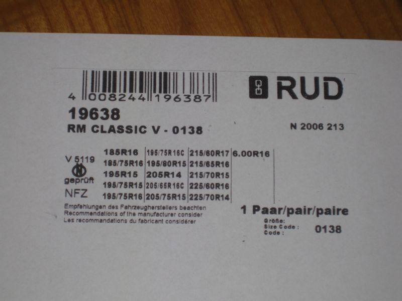 | Beschreibung: | Verkaufe Qualitäts-LKW-Schneeketten. RUD RM CLASSIC V - 0138! Unbenutzt! Geeignet für u.a. Wohnmobile, Allrad, Busse etc.. Preis: 220,- € bei Abholung, ansonsten + 11,90 € Versand. für folgende Reifen-Größen: 185R16,185/75R16, 195R15, 195/75R15, 195/75R16, 195/75R16C, 195/80R15, 205R14, 205/65R16C, 205/75R15, 215/60R17, 215/65R16, 215/70R15, 225/60R16, 225/70R14, 6.00R16 |