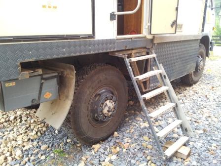 Voll eingerichtete Küche (Kochfeld (Diesel), Kissmann Kompressorkühlschrank mit Gefrierfach, Spüle) Edelstahl Wassertank 300 + 30Liter Warmwasserspeicher motorbeheizt und elektrisch heizbar Nasszelle Thretford( WC und Dusche), Doppelbett (1.95m x 1.40m) , Sitzgruppe durch Absenken des Tisches als 2.Doppelbett (1.80m x 1.10m) nutzbar, Klimaanlage Blizzard 90 auf Camper Dach montiert Motorradgepäckträger absenkbar und abnehmbar Durchgang Camper zur Fahrerkabine Rückfahrkamera, CD Radio Kennwood KDC 3051 Sandblechträger an Seite + 2 Sandbleche Hinterer Reifen Profil 90 % (Strassenprofil) + 4 Reservereifen 12.00R20 (Sandprofil) Camper Vordach Omnistore 1000