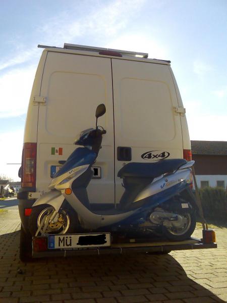 Der Träger ist zweigeteilt, u-förmig und wird in eine vorhandene Westfalia AHK eingeschoben. Voraussetzung ist die AHK mit rechteckigem Trägerprofil, in dessen Hohlträger der Motorradträger eingeschoben werden kann. Eine gleichzeitige Benutzung des Kugelkopfes ist dabei natürlich nicht möglich ! Flügeltüren lassen sich ohne Einschränkung öffnen, sobald Kraftrad abgeladen ist. Belastbar mit Roller, Vespa oder Enduro bis max 120kg.