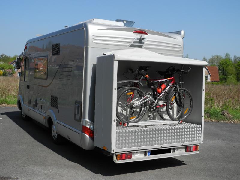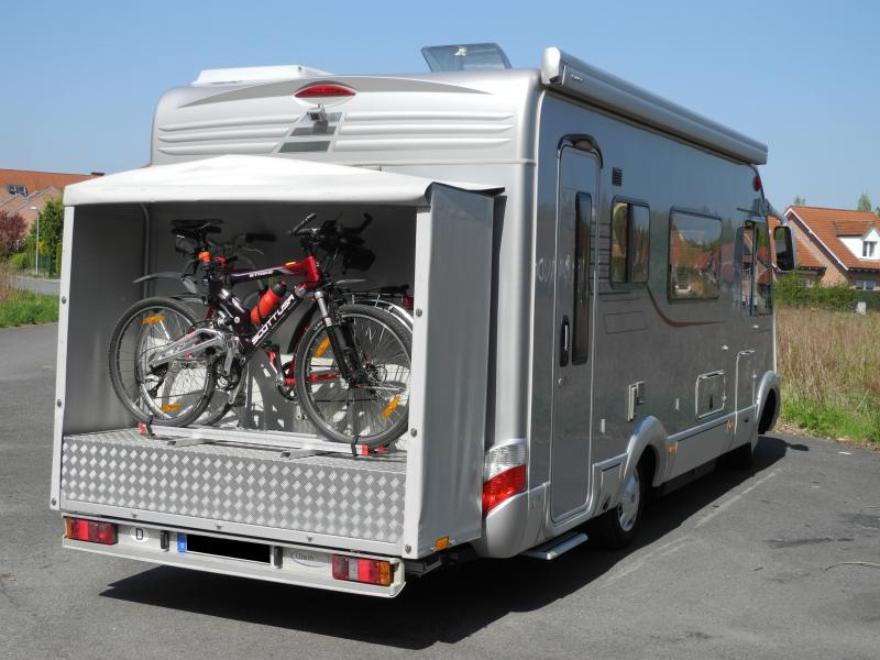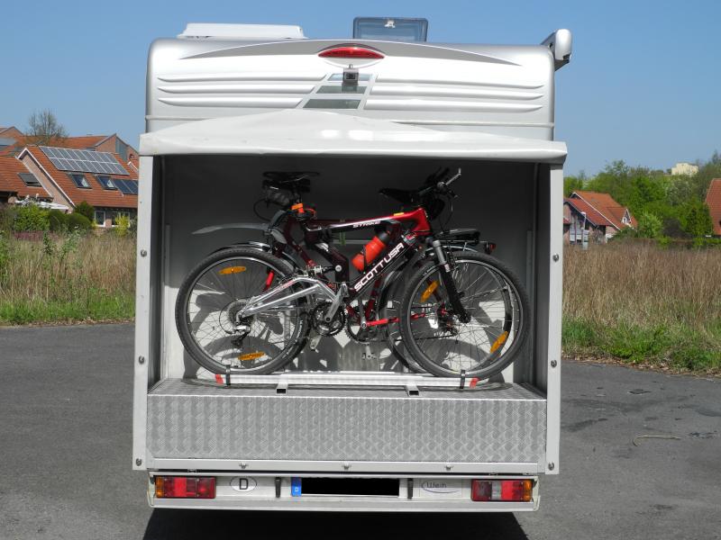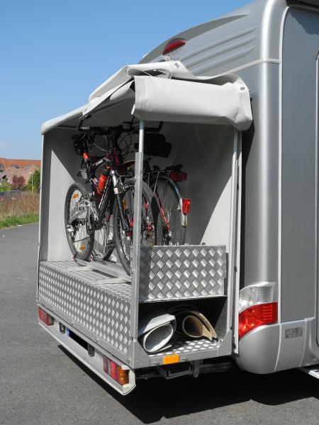 Die Box ist aus Aluminium gefertigt, besitzt eine abnehmbare Persenning und einen großen Staukasten sowie einen montierten Fahrradträger für 2 Fahrräder von Fiamma.