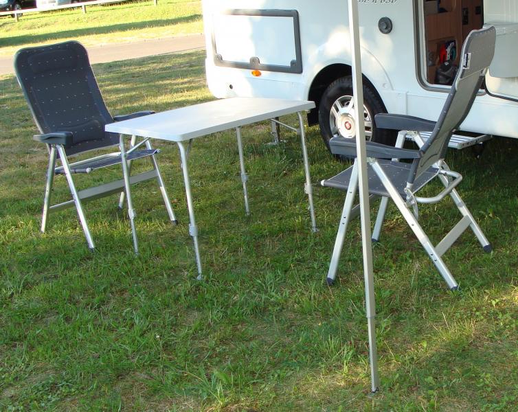 Der ideale Tisch für 2 Personen überzeugt durch sein geringes Gewicht und kompaktes Packmaß. Die in einem Stück hergestellte Kunststoffplatte ist resistent gegen Feuchtigkeit. Alle 4 Beine sind stufenlos verstellbar.