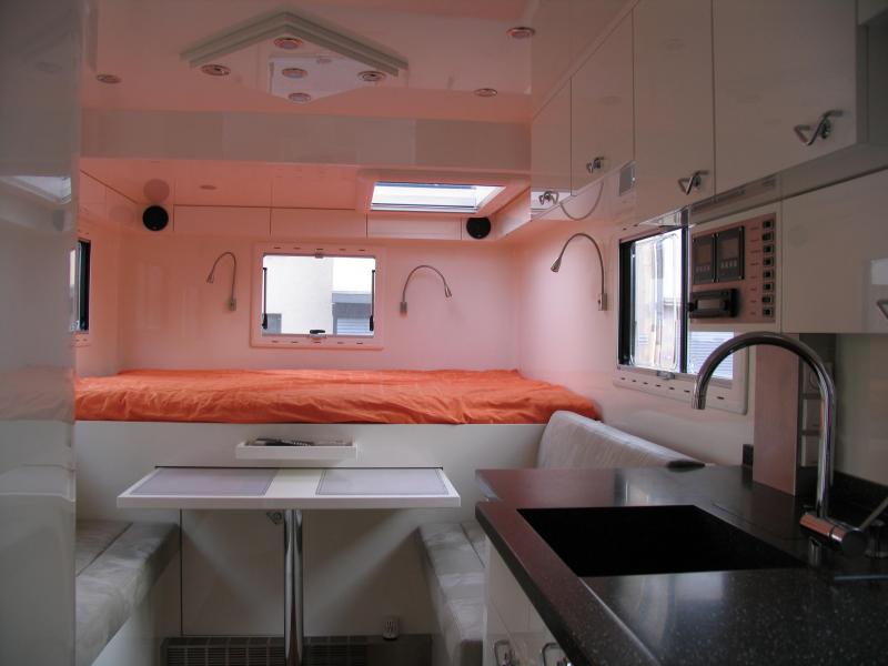 Schlafplätze Es gibt ein festes Heckbett 2,0 m x 1,40 m und ein Alkovenbett 2,0 m x 1,20 m. Die Zusatzmatratze und Federelemente im Alkoven haben wird rausgenommen (könnten kostenlos übernommen werden) und den Platz als Abstellraum genutzt. Der Alkoven ist mit zwei Schiebetüren zu verschließen.
