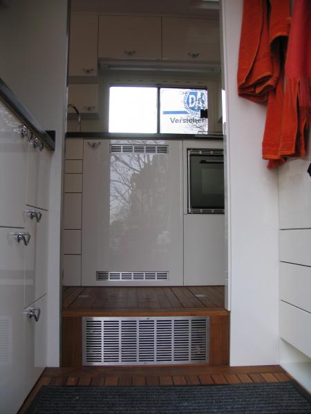 Wasser / Bad - Toilette Die komplette Wasserversorgung (Edelstahlleitungen) ist mit Einfüllfilter, Vorfilter u. Hauptfilter (Aktivkohle) ausgestattet. Die Porta-Potti (siehe Bild) kann mit wenig Aufwand durch eine Kassettentoilette (wie in fast allen Wohnmobilen verbaut) ersetzt werden kann. Ebenso ist eine Lösung mit festem Tank realisierbar. Auf eine Nasszelle haben wir verzichtet, um die Gesamtlänge von 6,99 m nicht zu überschreiten. Es gibt neben der Außendusche (mit Vorhang) eine Innendusche. Die Duschwanne befindet sich im Eingangsbereich, unter dem Boden, auf dem die Porta-Potti (siehe Bild) steht. Wasseranschluss u. Duschvorhang sind spritzdicht installiert.
