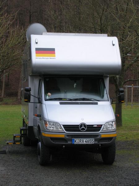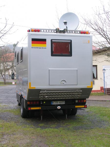 Ein paar Eckdaten Zulassung 11.2006 nach Fertigstellung Km Stand 62 000 Km Gewicht zul. GG ist 6 to incl. 1350 kg to Zuladung Maße 6,99 m lang, 2,30 breit und 3,25 hoch Antrieb Allrad mit Untersetzung und Sperren Motor Dieseleinspritzer Hubraum 2,7 Liter Leistung 115 KW / 156 PS Getriebe Wandlerautomat Bremse Federspeicherbremse mit Lufttrockner Bereifung 235/85 R 16 BF All - Terrain Zusatzkompressor mit Alutank für Reifenbefüllanschluss Hydraulikstützen 4 x je 2,9 to - automatische Nivellierung (seit 7.2009 neu) Zusatzluftfedern Hinterachse Querblattfeder Verstärkte Querblattfeder Vorderachs Klimaanlage autom. im Fahrerhaus Tempomat Zusatzlichtmaschine 85 A / 24 V nur für Aufbaubatterien Zusatzkraftstofftanks ca. 250 Liter