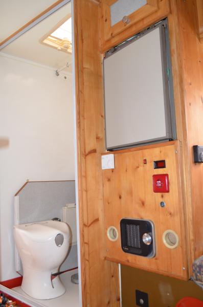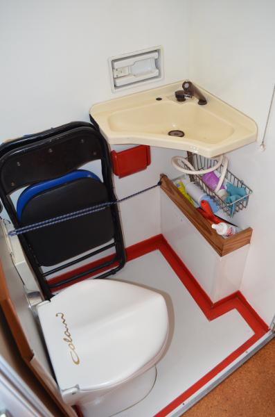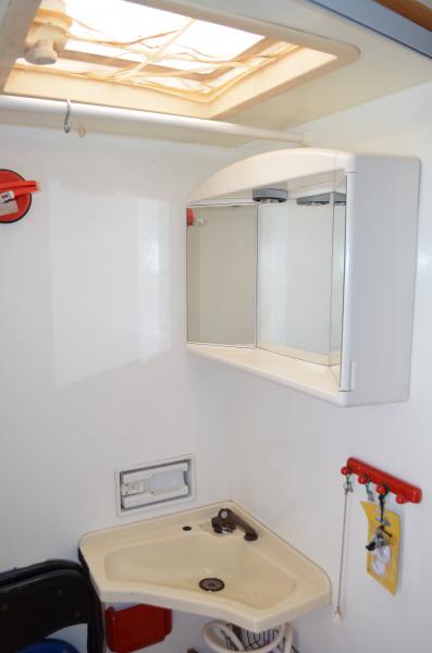 1 Waschbecken 1 Kombi Mischbatterie Wasserhahn kalt/warm und Duschbrause 1 Badezimmer Spiegelschrank mit Einbauleuchte 1 Ablauf zum Schmutzwassertank mit Deckel 1 Dusch-Schiebevorhang 1 Ablage für Bad Utensielien 1 Toilettenpapier Halterung 1 Dachfenster zum Aufkurbeln 1 Kaktus - Toilette zum Betrieb mit Deckelsäcken, keine Chemie 1 Kleider/Handtuchstange mit vielen Kleiderhaken 4 Handuchhaken 1 Warmwasser-Gasboiler 1 Aussenklappe zum Duschen im Freien