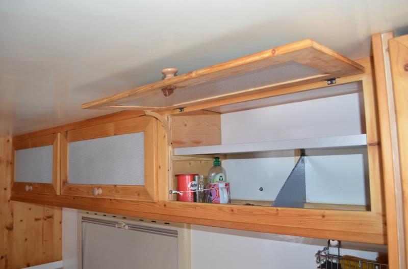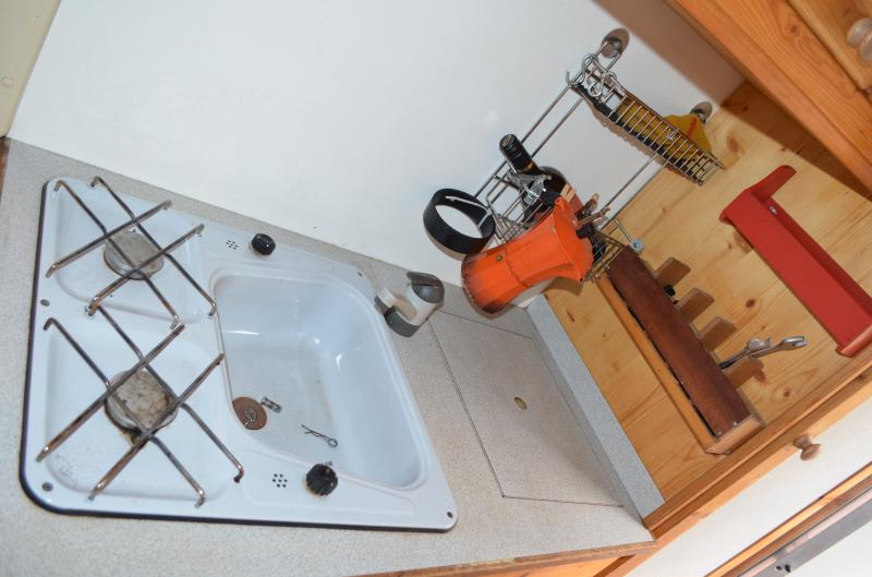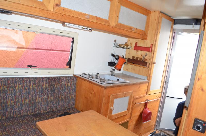 Gasherd 2 flammig Waschbecken mit Mischbatterie Wasserhahn kalt/warm 2 Hängeschränke für Lebensmittel 1 Unterschrank für Küchen Utensilien und Geheimfach für 2 Notebooks 3 Gasabsperrhähne für Herd, Heizung/Heißwasser und Kühlschrank 1 Besteckhalter 1 Gewürzhalter 1 Spühlregal/Edelstahl 1 Kühlschrank für Gas-, Batterie-, und 240V Betrieb