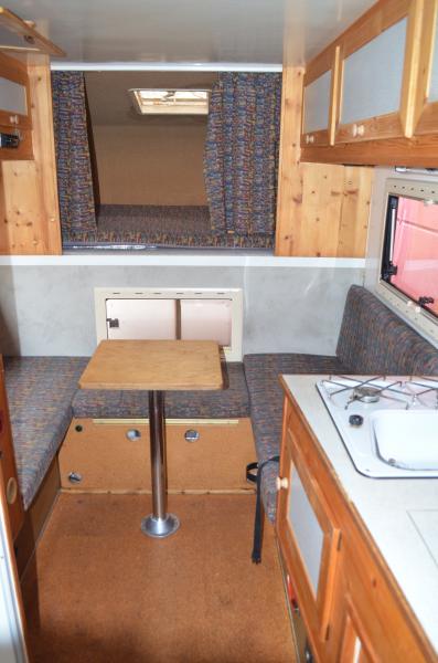 Ausstattung Wohnbereich 3seitige Sitzbank 2 Tische 3 Seitenfenster mit Mückengitter und Rollo Umbau zum Bett für 2 Personen möglich unter Verwendung des grossen Tisches und Sitzpolster 5 geräumige Hängeschränke 1 Schrank mit Kleiderstange für Hemden und Kleider 1 Gasheizung mit Raumthermostat, kombiniert mit Boiler 1 Elektro-Keramik Heizung 1600W/240V mit Raumthermostat für Campingplatz mit Stomanschluss 1 240V Einbausteckdose für Campingplatz mit Stromanschluss 1 Spannungswandler 12V/240V, 300W mit Einbausteckdose zum laden von Notebook und Mobile 2 Vorhängen zum Schlafraum 1 Wechsel-Ablage für Küche und Wohnraum 1 LED - Farbwechsel-Beleuchtung 2 Leuchtstofflampen 1 80l Nutzwassertank unter der Sitzfläche + Zulaufschlauch 10m und diversen Gardena Adaptern Zusatz Stauraum und Zugriff zur Pick Up Ladefläche