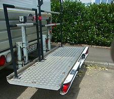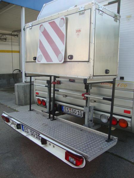 Dieser Telelift (Hecklastenträger) erlaubt Ihnen die Mitnahme von einem Motorrad, Roller, bis zu 5 Fahrräder, Segway oder Jet Ski. Die patentierte Lifttechnik erlaubt gängiges auf- und abladen mit 50-60 cm Absenkung. Der Lift wird entweder mit einer Kurbel bzw. einem Akkuschrauber (siehe Bild) bedient. Die Aufladung ist bis zu 200 kg möglich. Sie erhalten eine Bescheinigung mit der eine Eintragung in ihre Papiere nicht erforderlich ist.