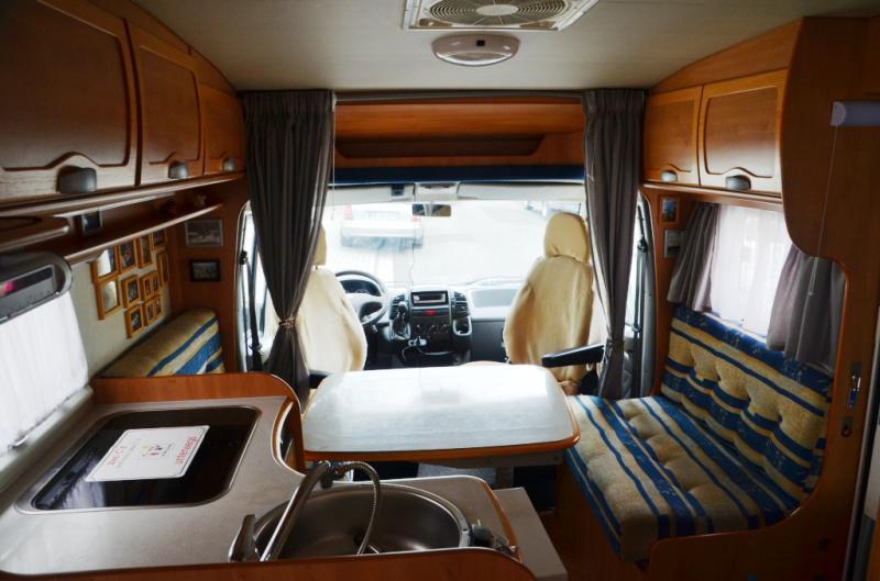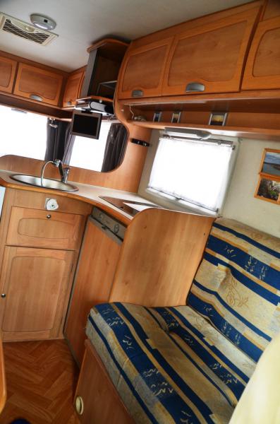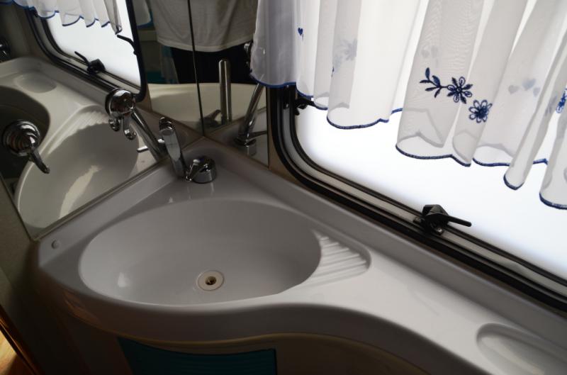 Seitensitzgruppe Rechte und linke Seite im vorderen Bereich 2 Sitze (Fahrer und Beifahrer-Sitz) mit Gurt drehbar zum Tisch hin (Pilotensitz) 1 Tisch veränderbar zum weiteren Bett im vorderen Bereich Bad separate Dusche Eckwaschbecken (erneuert 2013) Waschbeckenunterschrank Thetford Cassetten Toilette