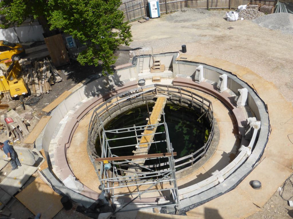 Daneben gilt sinnbildlich der Quelltopf des Donaubachs in der Nähe der Vereinigung beider Quellflüsse traditionell als Donauquelle („Brigach und Breg bringen die Donau zuweg“). Wir fahren daher nach Donaueschingen zu diesem Quelltopf. Leider wurden wir enttäuscht, denn der Qulltopf befindet sich gerade in umfangreichen Restaurationsarbeiten. So war nicht viel davon zu sehen. Trotzdem ein Bild: