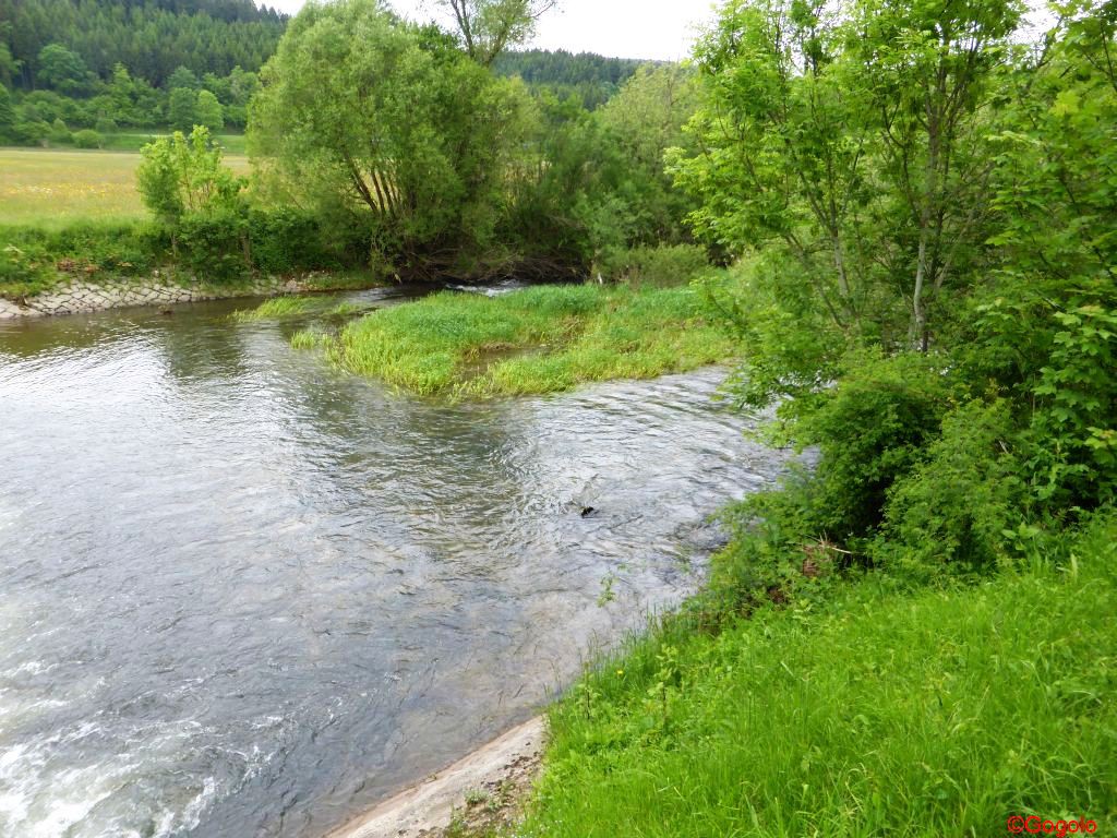 Die Donau hat momentan relativ viel Wasser und versickert nicht ganz, wird aber merklich sichtbar kleiner und schmäler.