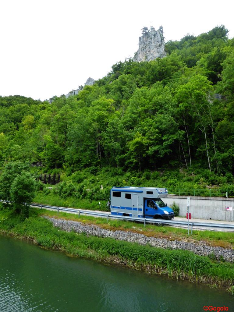 Auch hat dieses Kloster keine angeschlossene Gastwirtschaft, so dass wir bald wieder weiter fahren. Wir fahren durch das obere Donautal, wo sich der Fluss malerisch durch die Felsen zwängt und manchmal die Straße etwas eng wird. Auf dem Fluss sind viele Wasserwanderer mit ihren Booten und am Flussufer ist ein Jugendzeltlager neben dem anderen. Es sind halt Ferien.