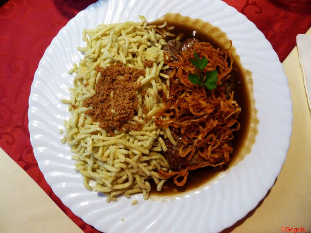 Wir wollen heute schwäbisch essen und folgen einer Empfehlung: zum „Gasthof Hirsch“ in Riedlingen, Lange Str. 17. Und es war (trotz – oder gerade wegen - Pächterwechsels im März 2015) eine sehr gute Empfehlung. Der schwäbische Zwiebelrostbraten mit Spätzle war ein Gedicht, das Fleisch war super zart und die Sauce sehr schmackhaft.