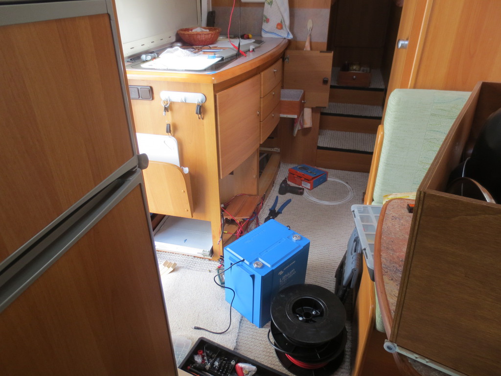 Gestern erfolgte der Austausch von 2x90 Ah Bleibatterien gegen eine 160 Ah Lithium von Victron incl.den erforderlichen Komponenten (BMS 12/200 usw) und einem Batteriemonitor BMV-702. Da auch einige vom Vorbesitzer installierten Verkabelungen zu entfernen waren :evil: hielt ich es für ratsam alles von einem Fachmann realisieren zu lassen :ja: ,und da ist man bei André ( AMUMOT) in besten Händen :daumen2: Dazu noch einige Bilder von der Aktion :lol: