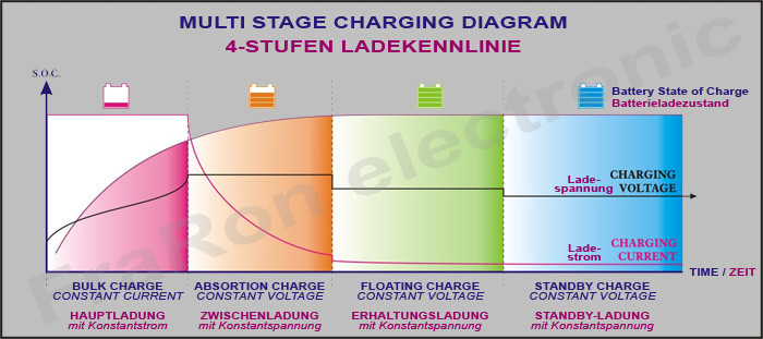 Ja, da hast du recht, war nur als Antwort Richi/Acki gedacht, eigentlich hier offtopic. So entwickeln sich halt manchmal Konversationen in Threads. Sehe ich als nicht so schlimm an, ähnlich plaudernder Studenten in der Vorlesung, wenn diese absolute 1er Kandidaten sind. :lol: Dein Alf Alf: Damit ist klar, dass vernünftige Ladegeräte mit gleichbleibendem Strom durch die gesamte Bulk Phase laden. Sobald durch den zunehmenden Innenwiderstand in Laderichtung (das macht die Batterie) der Istwert den Sollwert (Bulkspannung) erreicht, ist die Bulk-Phase nämlich beendet und es beginnt die Absorptionsphase. Dort ist der Strom kleiner als der Maximalwert (und er geht nun zurück) und die Spannung ("Konstantspannung") ist wieder geregelt. Nein!! Wird überall so dargestellt,die Horizontale in Bulk, stimmt aber nicht. Schau doch auf BC während der Ladung: fängt mit 20A (Calira EVS 30/20Amp) an u. 12,6V, geht rel. rasch 20 Min. auf 13,4V, danach langsam (7h) nach oben mit sukzessiv abfallendem Ladestrom, wenn 14,4V erreicht, Strom um 6 A u. Umschaltung auf Absorption. Booster Büttner 45A ebenso, fängt mit 40A an u. fällt ab, nicht erst nach Einsetzen der Absorption. Die Kurven zeigen nur das Mögliche, nicht das tatsächliche. Bleibe dabei: Konstantstrom bezieht nur auf schwankende Eingangsspannung. Gr. Richi Komisch, mein Fraron 30 A an der 280 Ah Batterie macht das so. Und die Batterie schluckt das auch. Hast Du zu schwaches Ladegerät? Oder laufen deine Kühltruhen parallel? Wo versickert der Strom? Liebe , Alf Verstehe das auch nicht, beide Systeme BC überwacht. Hauptsystem 20A Calira EVS an 2x 80Ah Ex. Gel, zuschaltber 50A Ring-Lader mit 4 oder 5 Typ-Einstellungen. Ansonsten 2.Sys. Ctek 25 A 80er Gel (Kühltr.), alle machen's wie beschrieben. Nix Stromplateau bis Absorption. Gr. Richi