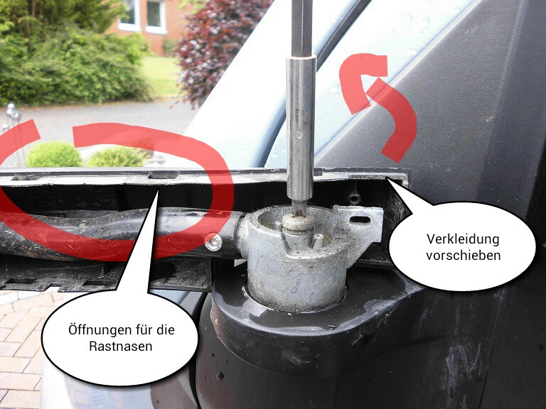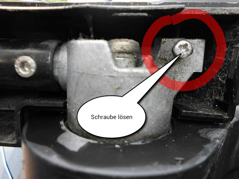 Die auf dem folgenden Bild markierte Schraube muss entfernt werden, dann kann man die vordere Verkleidung vorschieben, damit man zum Nachziehen an die senkrechte Verschraubung des Gelenkes kommt.