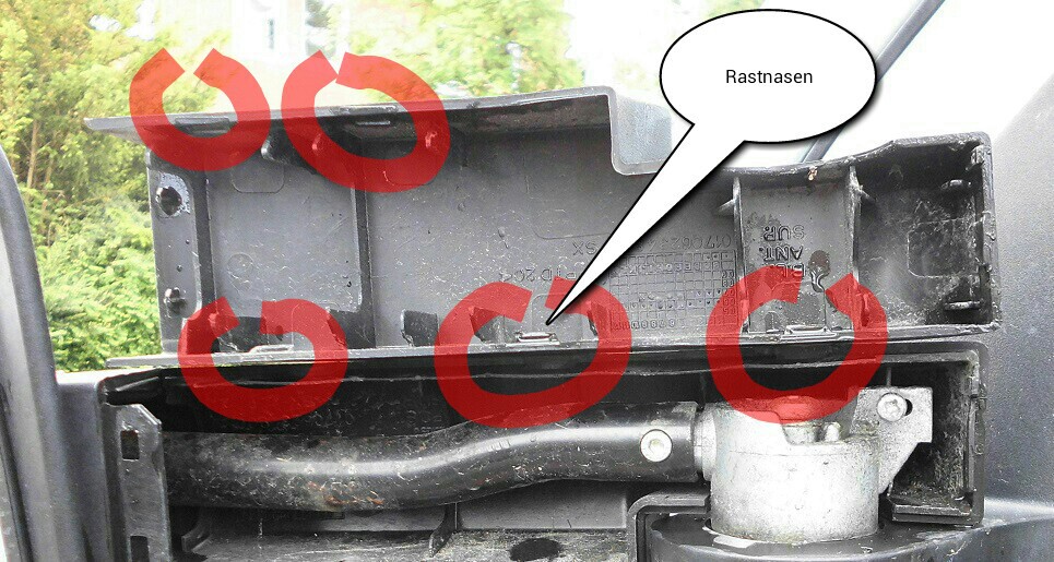 Die Verkleidung muss horizontal abgezogen werden, damit die inneren Rastnasen aus den entsprechenden Vertiefungen ausrasten können. Auf dem folgenden Bild habe ich die abgezogene Verkleidung um 180° verdreht auf die noch sitzende vorder Verkleidung gelegt. Die Position der Rastnasen habe ich markiert.
