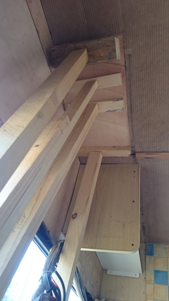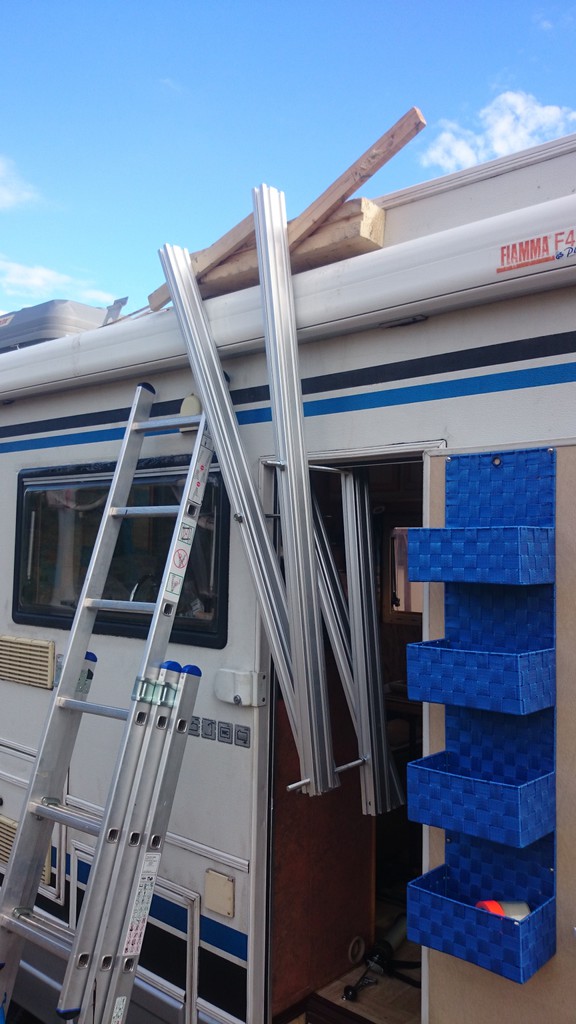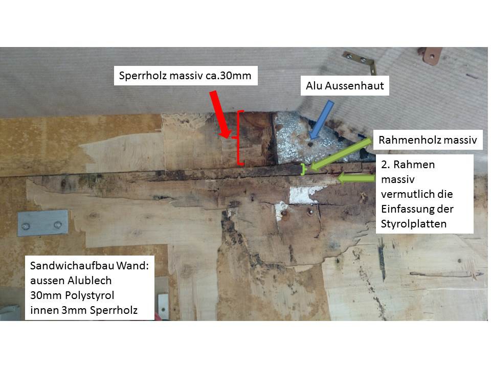 Im wesentlichen habe ich alles alte Holz innen entfernt. Dann neue Holzteile eingeklebt mit dem Caravankleber aus der Kartusche. Das Keilförmige Stück oben ist Multiplex massiv 26mm - war auch beim Originalaufbau so. Darunter noch eine Holzlatte. An den Seiten hatte ich das Treppenförmig ausgeklinkt, damit die Verbindung zur alten Struktur mehr klebefläche hat. Zum Einkleben habe ich mir aus Aluprofilen lange Schraubzwingen gebaut. In der Mitte werden 2 Balken durch eine Gewindestange M12 auf die Wandbreite voreingestellt, ganz unten ist dann noch eine Gewindestange, mit der man die Balken unten spreizen kann, so dass sie oben zusammenklemmen. Das klappt natürlich auch mit gewöhnlichen Holzbalken...