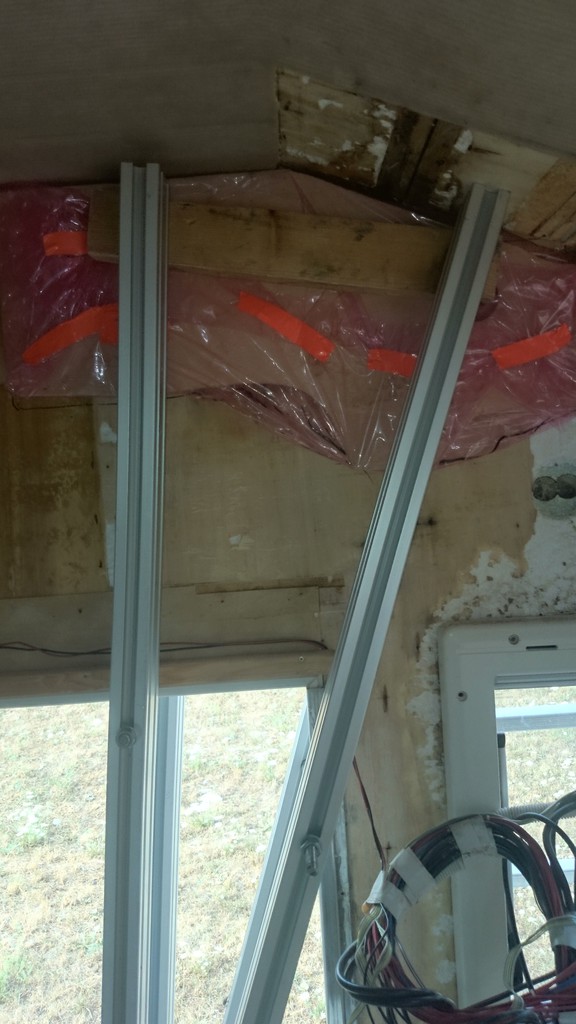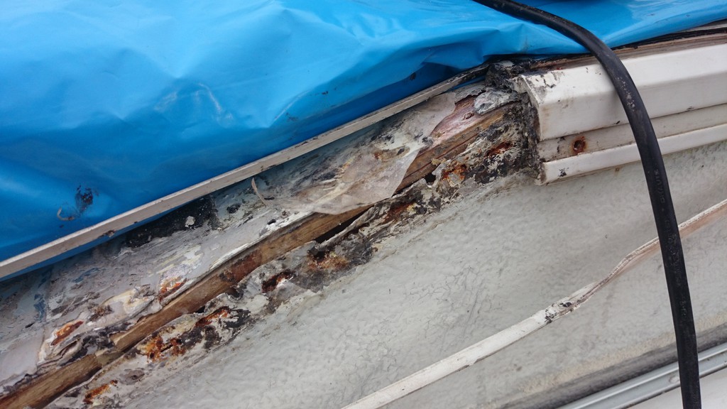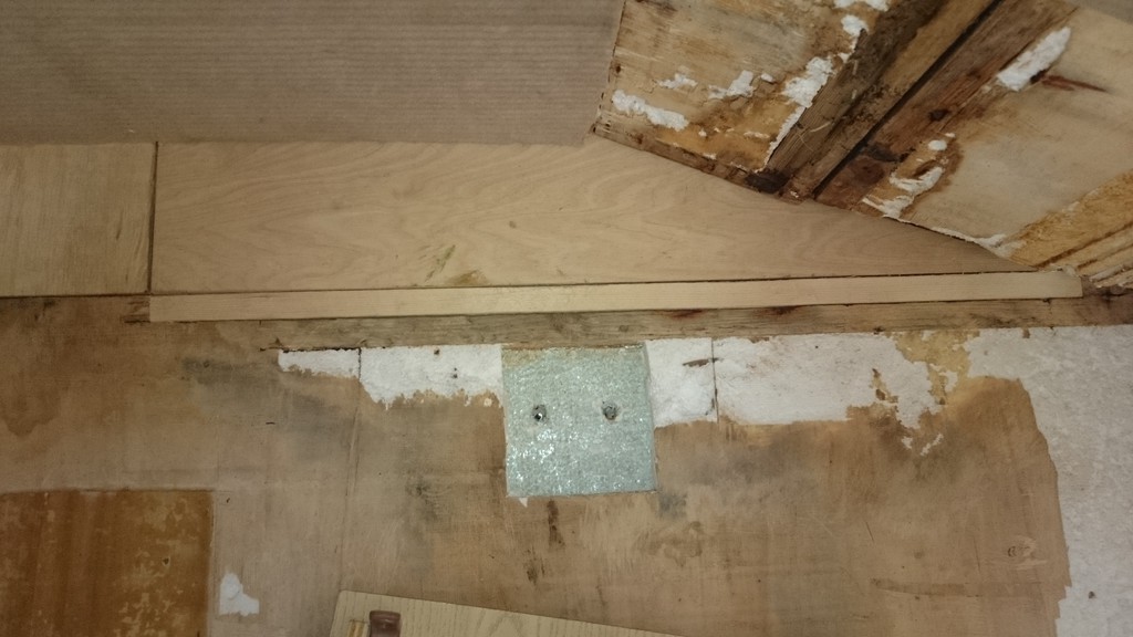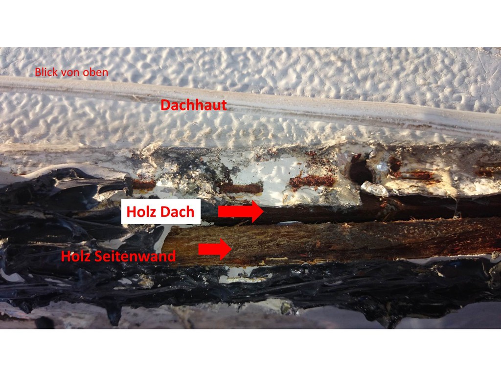 So, hab den Schaden weiter freigelegt. Der oberste Teil direkt am Dach wurde aus 30mm Massiv - Sperrholz gebaut und ist im Übergangsbereich völlig verrottet. Allerdings wird das Holz schon bald wieder fest, je weiter man nach links und rechts kommt. Ergo: Das Wasser muss direkt nach unten abgeflossen sein, weshalb auch die innere Sperrholz-Deckschicht weggefault ist.
