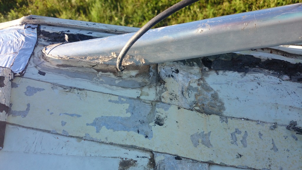 Die Abdeckleiste hatte ich schon entfernt, heute habe ic hdie alten Klammern und Schrauben entfernt, sowie alles blankgeschmirgelt. Dabei viel auf, dass an den Klammern / Schrauben Alufraß zu finden war.... 2. sind sehr viele Löcher drin, von den alten Schrauben. Außerdem 2 kleine Risse am Blechrand. Das Holz vom Dach ist ok.