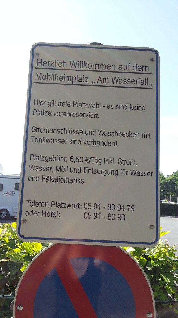 Nun mal ein paar Daten und Fotos zu dem Stellplatz: Der Stellplatz ist von Lingen Richtung Emsbüren über die L40 (Schüttdorfer Straße) zu erreichen. Der Stellplatz ist ausgeschildert (erste Abbiegung befindet sich in Höhe des Kernkraftwerks). Von Emsbüren kommend ist die Zufahrt für Wohnmobile über 3,20m Höhe wegen einer Bahnunterführung nicht möglich, bzw. nur mit Umweg möglich. Der Stellplatz befindet sich direkt vor einem Dauercampingplatz am Emswehr/Wasserfall in Lingen/Hanekenfähr. Er verfügt über 12 Stellplätze. Jeder Stellplatz hat einen eigenen Wasser- und Stromanschluss. Die Stellplätze sind mit Holzpfosten voneinander getrennt. Vor dem Stellplatz befindet sich die Entsorgungsstation. Die sanitären Anlagen auf dem Campingplatz befinden sich in unmittelbarer Nähe des Stellplatzes und können mitbenutzt werden. Die Duschen allerdings gegen Gebühr. Da wir diese nicht genutzt haben, ist mir der Preis nicht bekannt. Die Stellplatzgebühr beträgt 6,50Euro /pro Tag inklusive Strom, Wasser, Müll und Entsorgung. Die Stellplätze sind auch für große Wohnmobile ausreichend groß genug. Der Stellplatz ist sehr gepflegt. Da er sich in unmittelbarer Nähe der Ems und des Dortmund-Ems-Kanals befindet, ist Lingen gut mit dem Fahrrad oder zu Fuß zu erreichen. Landschaftlich schön gelegen. ![]() Bezahlung erfolgte im Hotel "Am Wasserfall". Unter der Telefonnummer konnte niemand erreicht werden. Das Hotel befindet sich hinter dem Campingplatz. ![]() Entsorgung ![]() linke Seite Stellplatz ![]() einzelner Stellplatz mit Wasser und Stromanschluss ![]() Wasserversorgung ![]() Stellplatzeinfahrt ![]() hallo Susanne, auf dem Foto hab ich es leider nicht erkennen können: Gibt es für die Entsorgung (Grauwasser) einen überfahrbaren Bodeneinlass? Danke, Volker ;-) Hallo Volker, nein, einen überfahrbaren Bodeneinlass gibt es nicht. Man muss einen Abwasserschlauch an dem System des Womos befestigen und kann dann das Abwasser an der Sanistation entsorgen. Im Gebüsch stand noch zusätzlich ein Rohr,welches auch benutzt werden konnte. Allerdings haben wir das nicht wirklich verstanden :D ![]() Ansonsten fanden wir den Platz für die Kosten absolut genial! Hallo, auf der Karte sieht man in unmittelbarer Nähe ein Kernkraftwerk. Ist dieses noch in Betrieb? Auch sieht der Weg nach Lingen in das Zentrum weit aus. Wie weit ist es zu Fuß oder mit dem Fahrrad? Gibt es einen schönen Weg, eventuell an der Ems lang? Danke und Michael