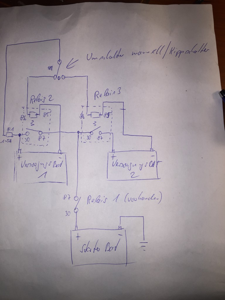 Ich weiß, sicher wurde das hier schon mehrfach diskutiert. Die schnelle Suche sowohl hier als auch bei Onkel Google brachte jedoch nicht das Gewünschste. Iststand: Starterbatterie 90Ah und Versorgungsbatterie 90Ah mittels Trennrelais "normal" verkabelt. Zur Frage: Verkabelungsfrage zur folgenden Idee: Ich möchte eine weitere Versorgungsbatterie verauen. Sie wird in unmittelbarer Umgebung der Zweitbatterie verbaut. Ich würde diese gern so schalten, daß ich sie als Alternative zur ersten Versorgungsbatterie schalten kann. Ist die erste also geleert möchte ich umschalten können. Entsprechend wird die eine oder halt andere duch die Lima im Fahrbetrieb gefüllt. Laden werde ich beide mittels externem Ladegerät via Landstrom können. Ich bräuchte nur ein Verkabelungsvorschlag um von der einen zur zweiten Batterie schalten zu können. Manfred Wenn die Leistung ausreicht, dann kann so etwas als Umschalter eingesetzt werden. Die Ansteuerung kann über einen Wahlschalter (2 Stellungen rastend) realisiert werden. Amazon Link , Oskar Du kannst das so machen mit zwei Hochstromrelais die 60-80A können + einen Schalter..... ![]() oder damit Link zum eBay Artikel Der Batterieumschalter von Ebay...ist der "komplett"? Oder sind darüber hinaus noch weitere relais etc. nötig? Das wäre (wenn komplett) ja ne nette Sache, optisch auch halbwegs ansprechend. Manfred ...braucht man nur verkabeln... Der ist für hohe Lasten ausgelegt und kann die unterbrechen. Wenn du vom Fahrerplatz aus das bedienen möchtest würde ich die Relais Variante nehmen...da brauchst du nur einen Schalter am cockpit.