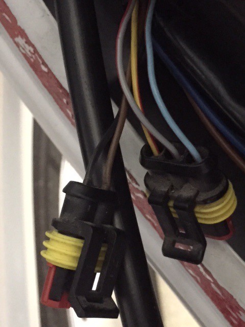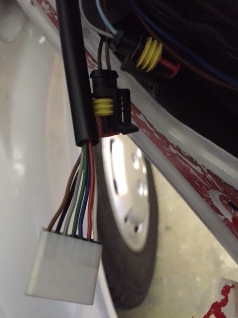 Die AMP-Superseal Stecker sind am Fahrzeug montiert, der weiße 5-fach-Stecker ist am neuen Spiegel montiert. (Aufnahmen sind von der Beifahrerseite gemacht.)